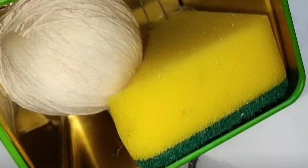 然後我們可以準備一個這樣的茶葉盒,然後把這個海綿擦放進茶葉盒裡邊,然後再把這些線也放進去,最後蓋好蓋子,就達到了一個收納的效果,而且這樣看上去非常的整齊。