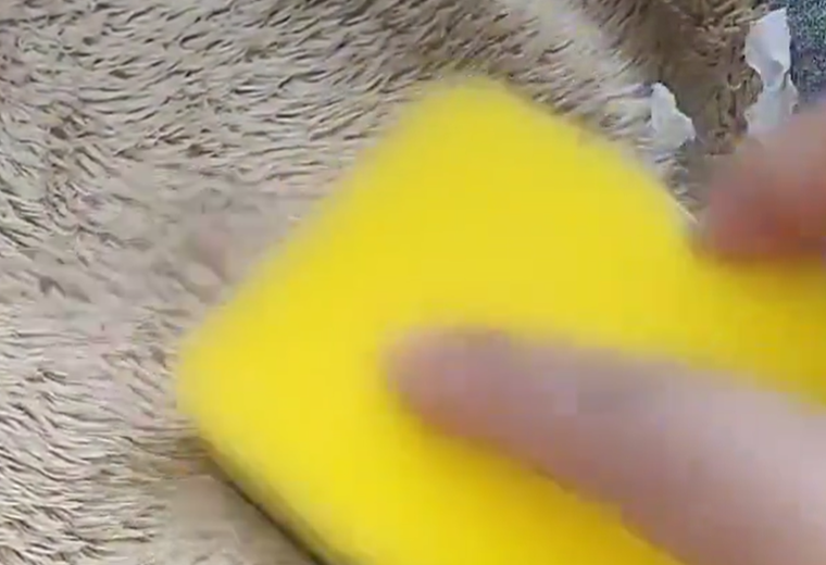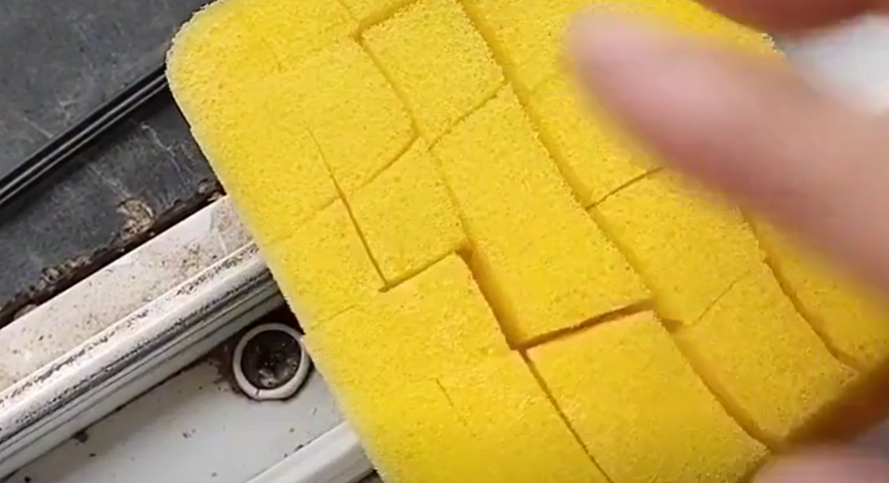 妙用五,清洗窗臺縫隙。我們這個窗臺縫隙其實是非常難打掃的,這個時候可以準備一個海綿擦,然後用刀把黃色的這一面均勻的割開,用水打溼之後把水擰乾,然後這個時候我們再來清洗窗臺縫隙就可以很好的清潔了,清潔過後窗臺縫隙立馬變得很乾淨。