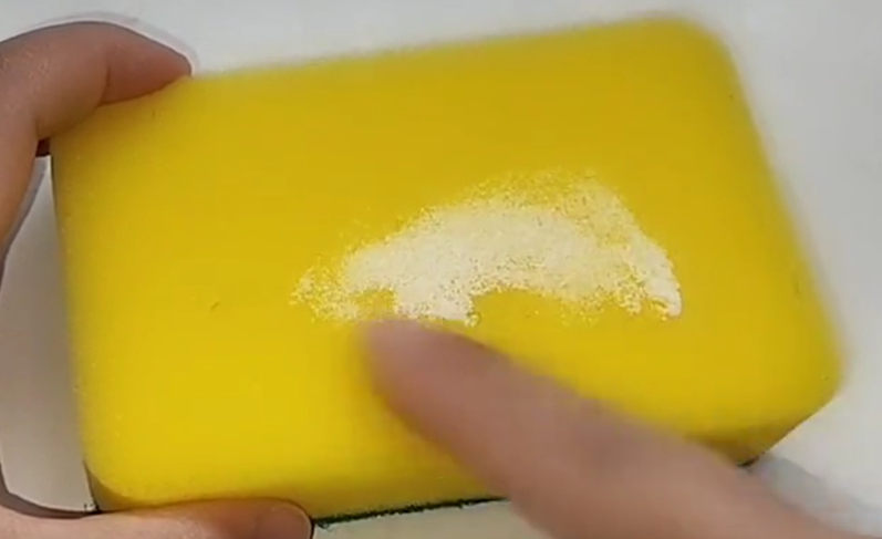 妙用二,去除異味。準備一個海綿擦,再準備小蘇打,把小蘇打倒在海綿擦上面,倒好之後用手塗抹均勻,讓小蘇打滲進海綿擦裡邊,
