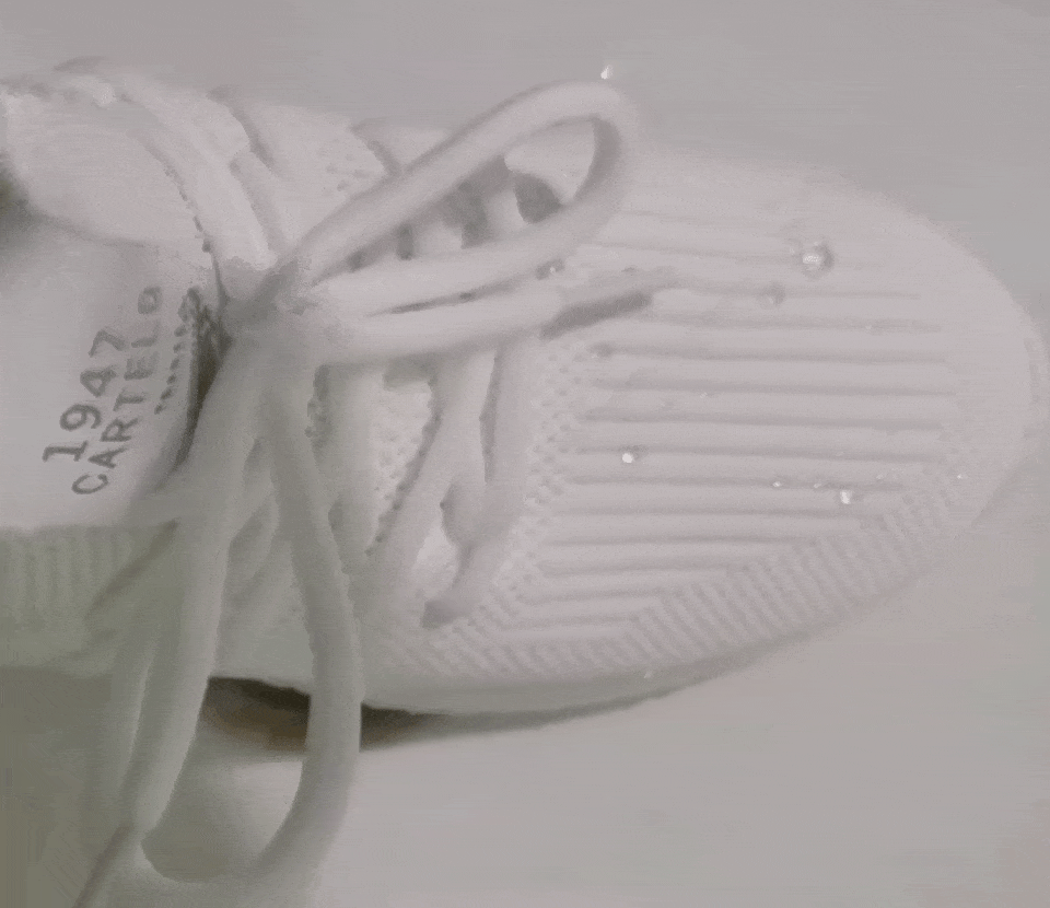 而這款鞋子的防水性,就是依照荷葉的防水技巧設計而成,就好像給鞋子穿了一個防護層。