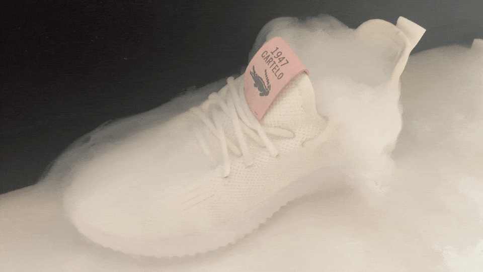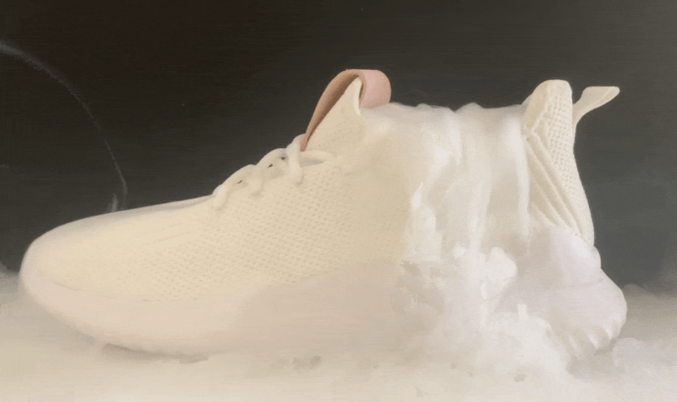 不信你看!把乾冰放在鞋內,霧氣順著空隙不受阻的向外迸發,展現出優越的透氣性。