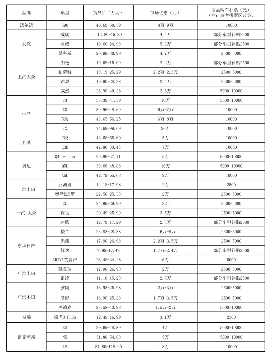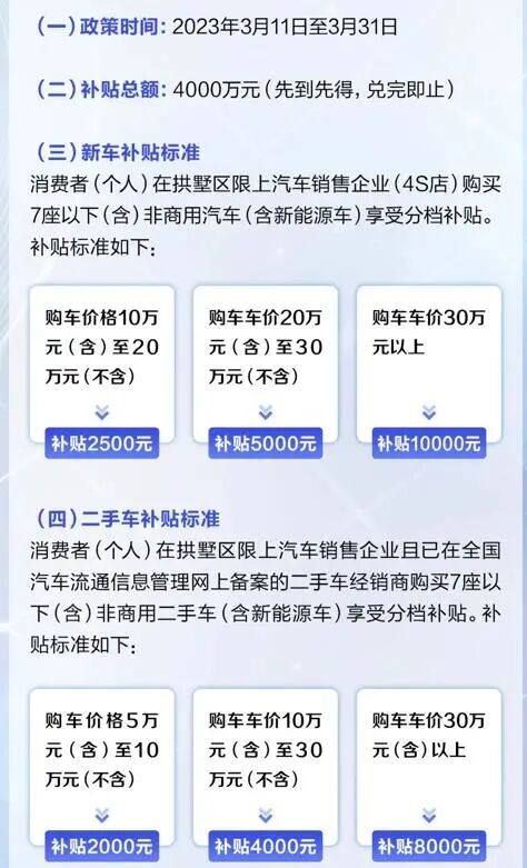 此次拱墅區購車補貼的有效期為3月11日-3月31日,消費者(個人)購買7座(含)以下非商用汽車(含新能源車)即可享受分檔補貼,其中新車分三檔:車價10萬元(含)-20萬元的補貼2500元、車價20萬元(含)-30萬元的補貼5000元、車價30萬元(含)以上的補貼10000元;二手車也分三檔,車價5萬元(含)-10萬元的補貼2000元、車價10萬元(含)-30萬元的補貼4000元、車價30萬元(含)以上的補貼8000元。