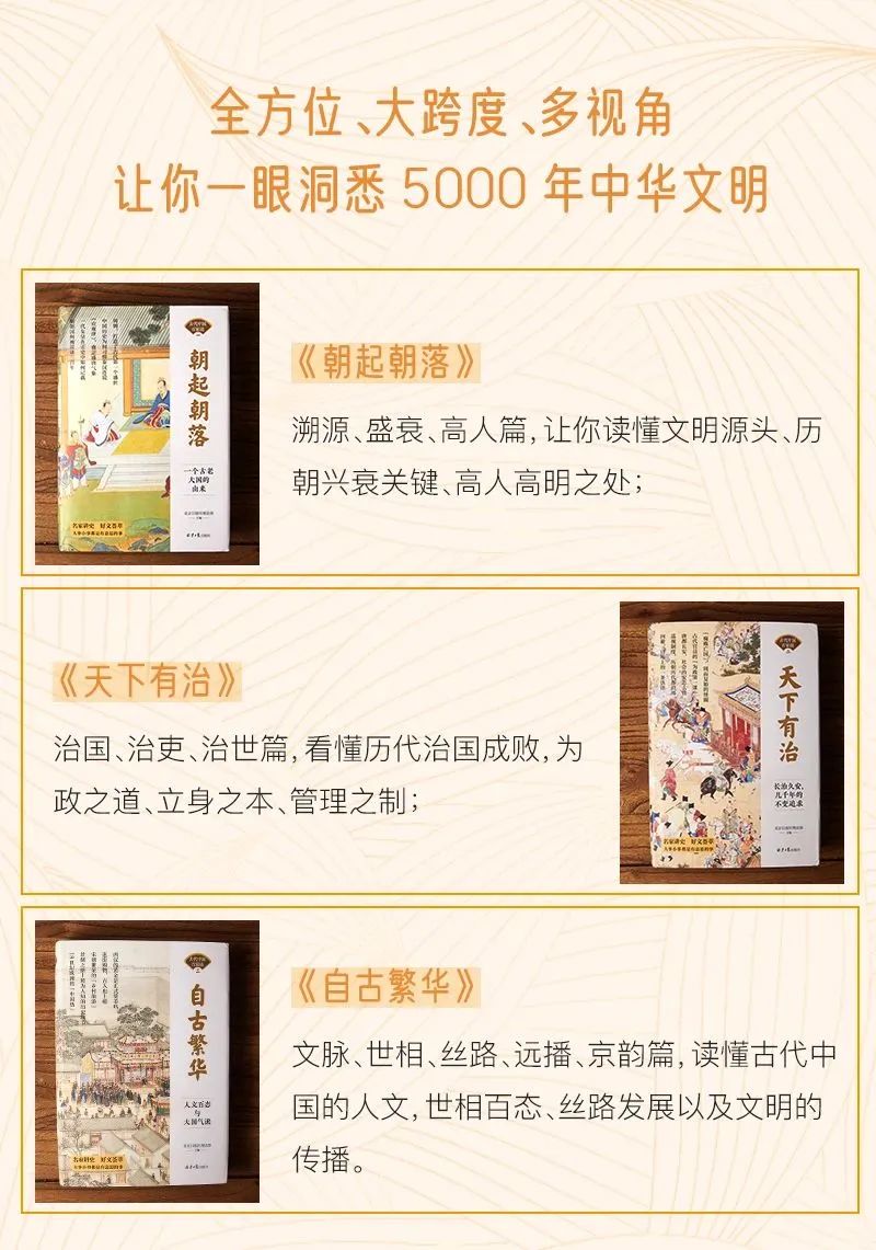 三本書,3大視角,11個主題,240多篇文章,全方位講述了中國古代五千年的悠久歷史,