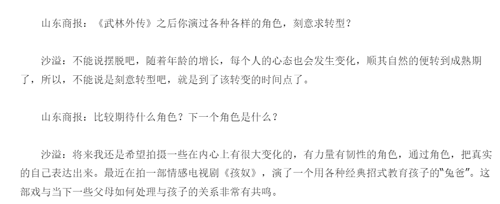 結婚生子的沙溢想要再重新進入影視圈主流已經完全不可能,但就像沙溢在採訪中說的那樣,要順應年齡的變化。於是,沙溢在影視作品中開始塑造父親類型的角色。