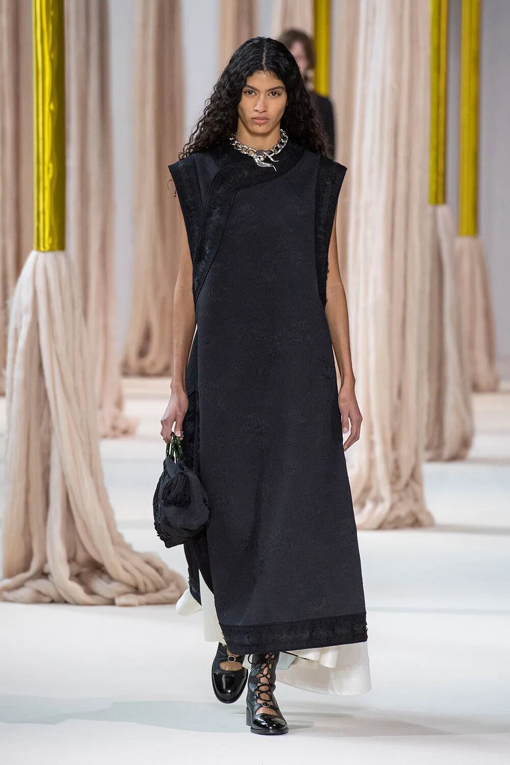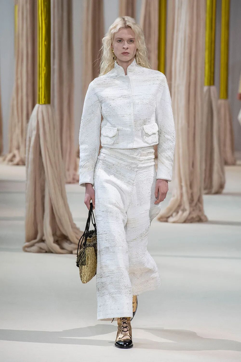 源於西方的斜紋軟呢布加上金屬流蘇絲線,變成了一種有華麗肌理感的面料。套裝以中式立領、下垂線條將斜紋軟呢的體積感收攏,而金屬流蘇絲線的立體效果又豐富了中國傳統的平面直線裁剪風格。