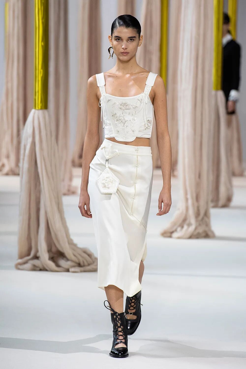 中式荷包的形態被廣泛運用在這次的廓形設計上,宛如心房的荷包形態能在整體廓形和細節處窺見,搭配優雅的馬面裙,以拉鍊、金屬扣的設計注入了些硬朗的元素。