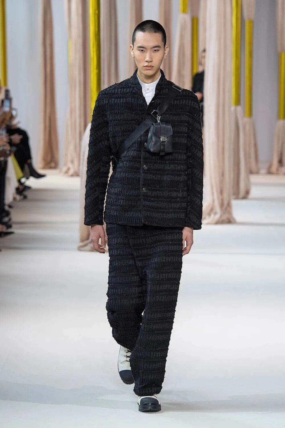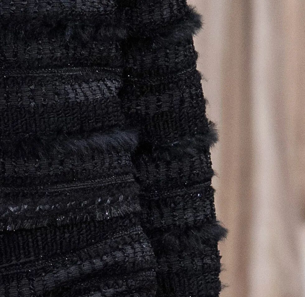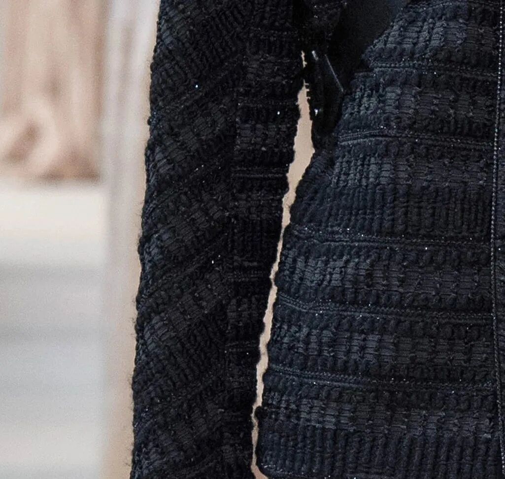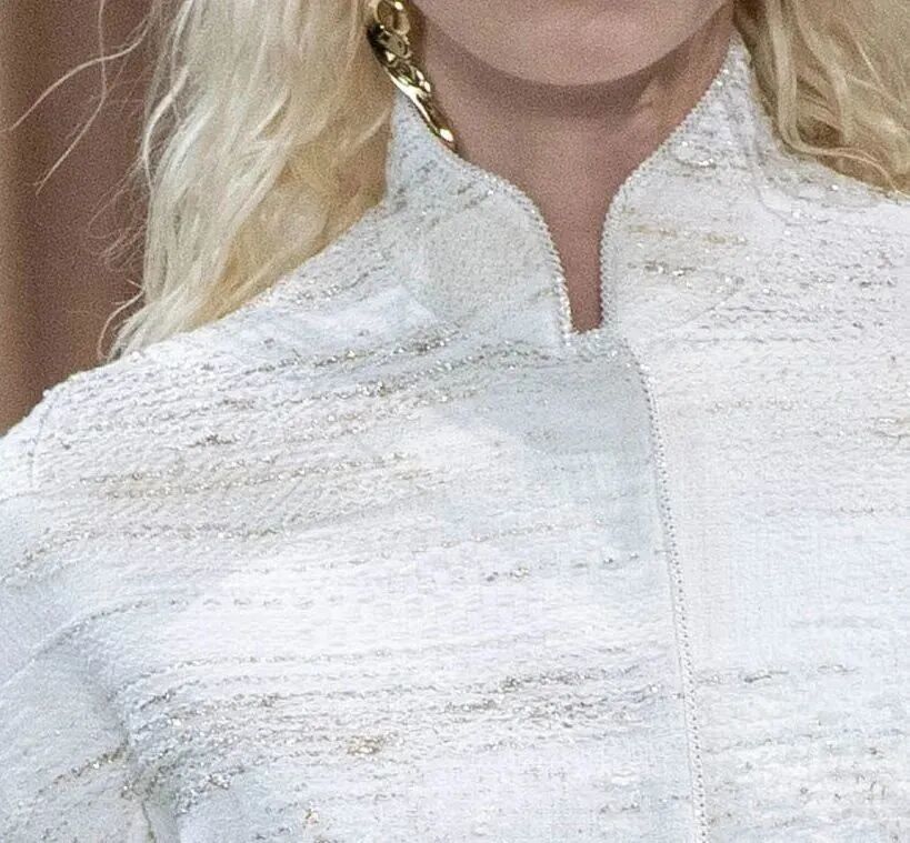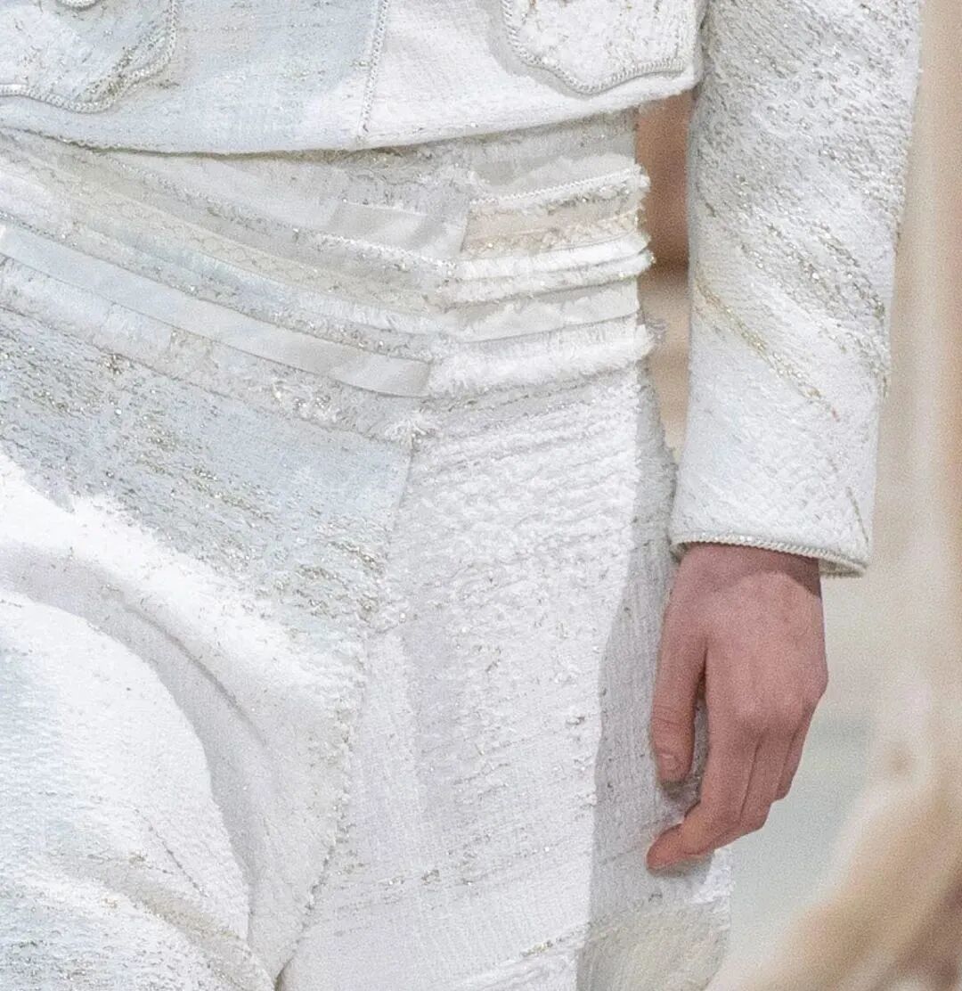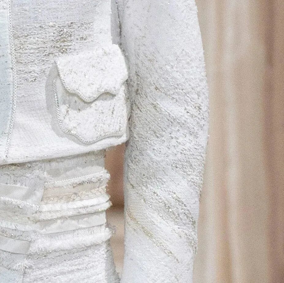 源於西方的斜紋軟呢布加上金屬流蘇絲線,變成了一種有華麗肌理感的面料。套裝以中式立領、下垂線條將斜紋軟呢的體積感收攏,而金屬流蘇絲線的立體效果又豐富了中國傳統的平面直線裁剪風格。