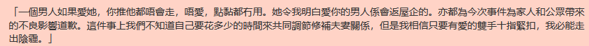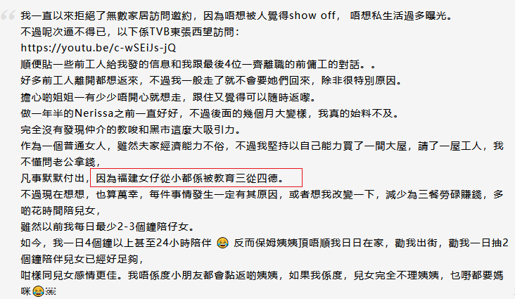 而蔡一鳳後來也po文為自己辯解,說自己“福建女仔從小被教育三從四德”,所以作為普通女人堅持以自己能力買房、請傭人,還表示自己現在有了大把時間陪孩子,更再次點名中介教唆。
