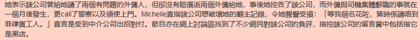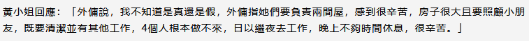 中介還表示,蔡一鳳炒掉兩個人後,剩下的4個傭人們要打掃兩個房子,根本做不完所有工作,日以繼夜打工,甚至都沒有時間休息。另外,被指偷竊的傭人們還接連去過勞工處求助,報警找領事館要證明自己的清白。