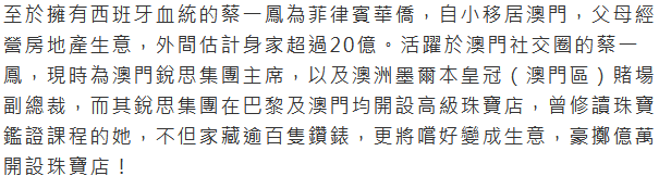 家裡的產業涉及金融和房地產,據悉蔡一鳳自己的身價就有將近20億。而她自己在中國、英國都有經營珠寶店,同時還經營著家族在中國澳門的賭場生意。
