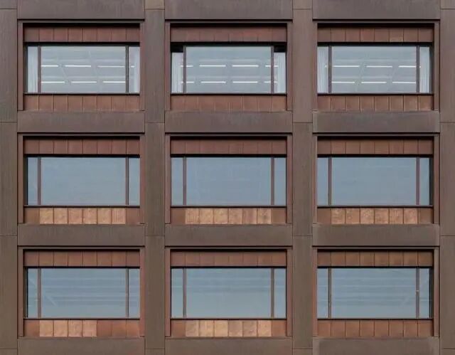 建築佇立在高於街面的基座上,修長簡潔的幾何形態與建築表面的材料顏色讓其顯得格外突出。鋼筋混凝土框架結構外包裹銅皮成為建築外觀的主要構成元素,窗戶嵌入結構體系當中,使立面具有浮雕飾板一般的體量感。