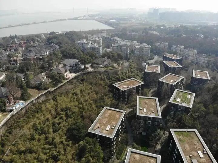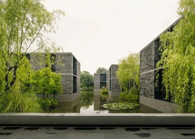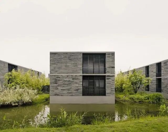 項目位於杭州西溪國家溼地公園,景觀、建築與水系之間關係成為設計的重點。建築宛如一個個深色石塊,鑲嵌於受自然溼地啟發的水系花園中,與綠色的周邊環境形成鮮明的對比。方正的深色體量相互措置,形成村落般的佈局形態。石基成為建築的基礎,樓板與砌體之間的結構關係在立面上清晰可見。