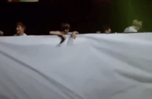在EXO演唱會中,有一個環節是他們在舞臺上隔著紙板換衣服,粉絲在臺下可以看到他們換衣服的投影,結果沒想到紙板突然破了,還沒換好衣服的成員被嚇了一跳,