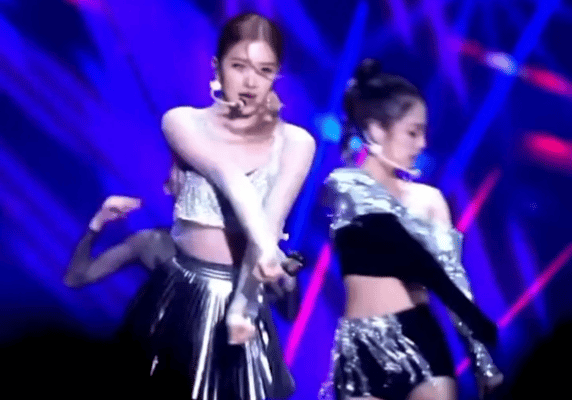 Rosé很快就注意到了,並迅速用手抓住避免了衣服的滑落,同時還在繼續表演,