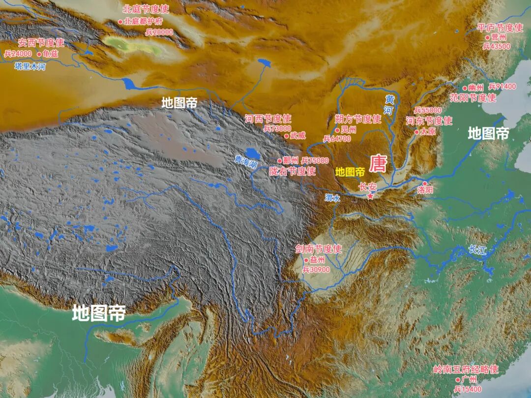 天寶時期,大唐在東北、正北、西北和西南共設置十個藩鎮,其中安西節度使和北庭節度使共轄四萬餘人,鎮守西域;劍南節度使和嶺南經略使統領五萬餘人,防備南蠻。僅從位置上就不難看出,以上四鎮對於應付國內叛亂顯然有些鞭長莫及。剩餘的六個節度使分別是河東、范陽、平盧、河西、隴右和朔方,其中哥舒翰控制河西和隴右,安思順負責朔方,而安祿山一人就獨霸河東、范陽和平盧。換句話說,此時的安祿山是有足夠的實力與底氣與大唐分庭抗禮的。