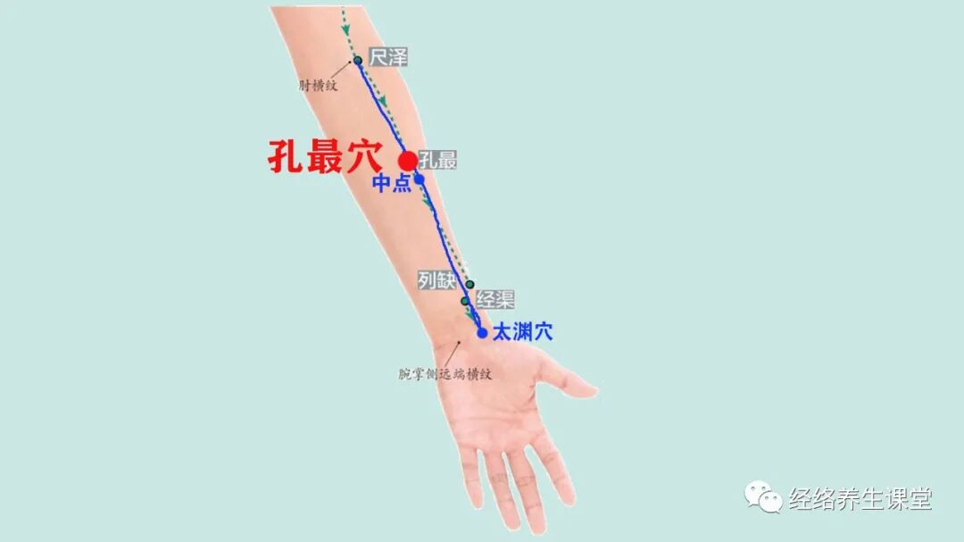 怎麼找孔最穴呢?標準定為是這樣說的,在前臂前區,腕掌側遠端橫紋上7寸,尺澤穴與太淵穴連線上。相信大家看到這樣描述,不好找到。告訴大家一個簡單的方法:伸臂仰掌取穴,從尺澤穴至腕橫紋外側端脈搏搏動處連線的中點向上約一橫指處。或者伸臂仰掌,另一手握住該手臂前臂中段上緣處,拇指向上推約一橫指,按到痠痛明顯處就是孔最穴。具體找法看下圖。