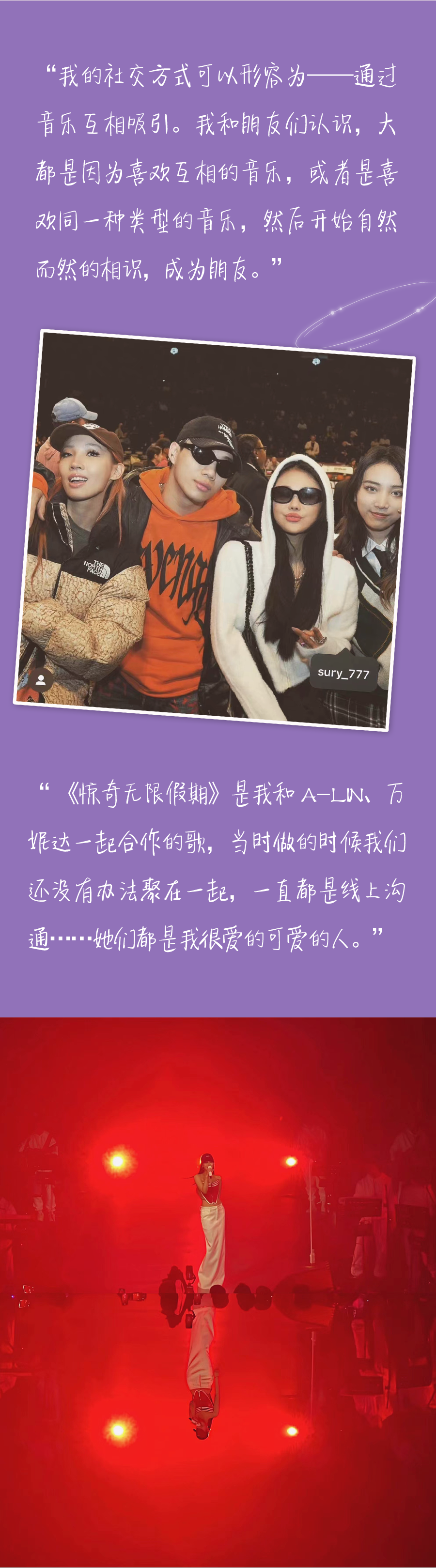 剛剛結束的十週年成都演唱會,叫做“驚奇無限假期”,名字來自她專輯《TRIP》中的一首歌,也包含了她對“假期”這個詞的偏愛。