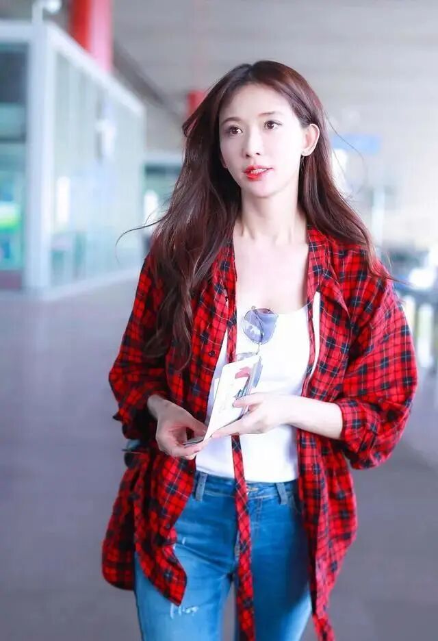 穿上顏色鮮豔的紅色格子襯衫,林志玲更顯少女,靚麗的紅色給人一種眼前一新的感覺,寬鬆的版型看起來十分舒適。她隨意解開了襯衫的扣子,裡面搭配了一件白色吊帶,剛好顯露了她明顯的鎖骨,襯衫領子上的兩根絲帶起到了很好的點睛作用,讓她走起路來有些飄逸輕盈。下裝她穿了一條牛仔褲,水洗藍的顏色本就顯瘦,緊身的設計使她看起來非常苗條。