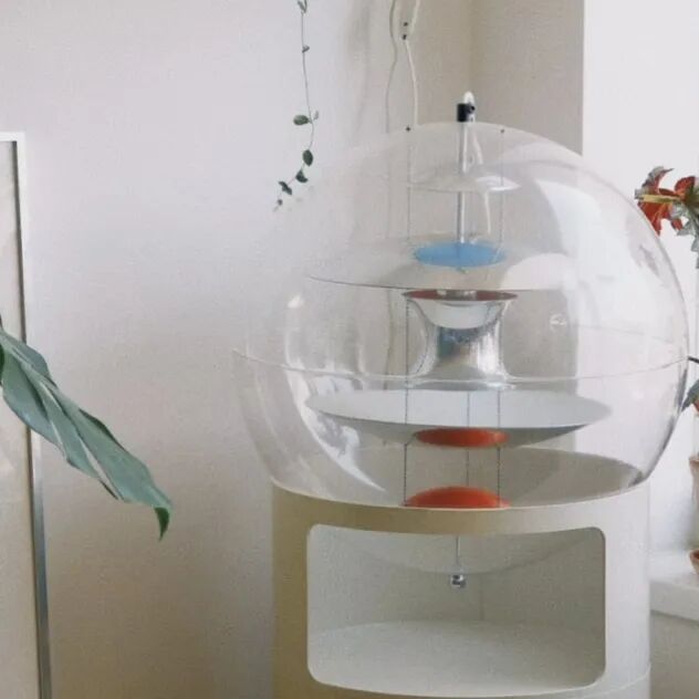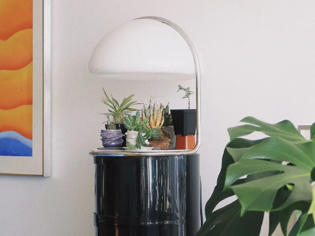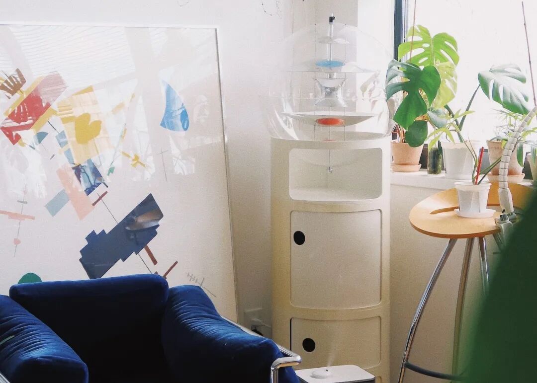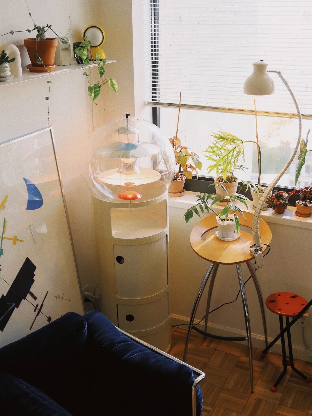 雖然買下來了,但是因為是租的房子,吊燈無法掛上去。直到某天在紐約本地的跳蚤市場看到了一箇中古的 Componibili 儲物櫃,發現兩個物品的尺寸剛剛好。大玻璃球燈找到了它的容器。