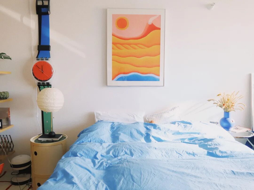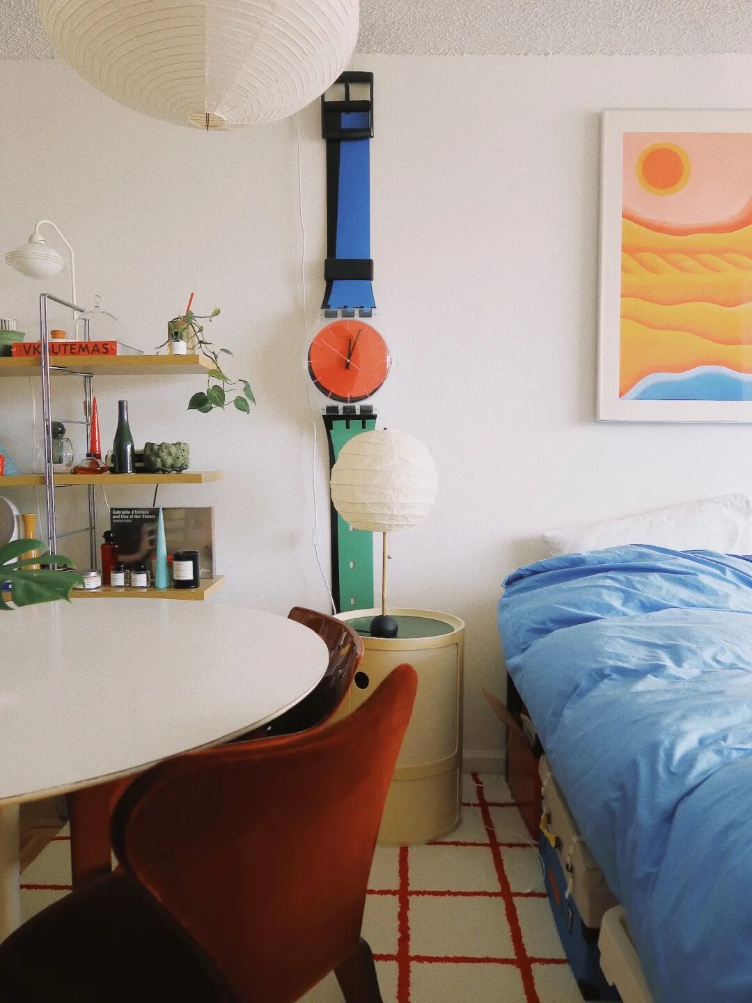 第一件進入這個家的傢俱是是一個巨大的 swatch 的表,上方“錶帶”是經典的藍色,錶盤是經典的紅色、下方經典的綠色,掛在家裡讓人耳目一新。這塊巨大的表掛在牆上,也將起居室和睡眠區做了區分。