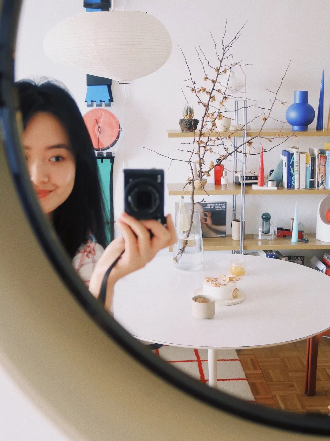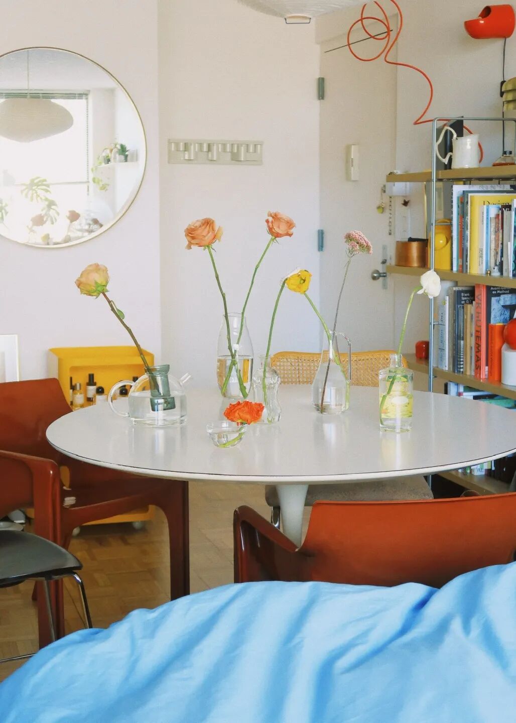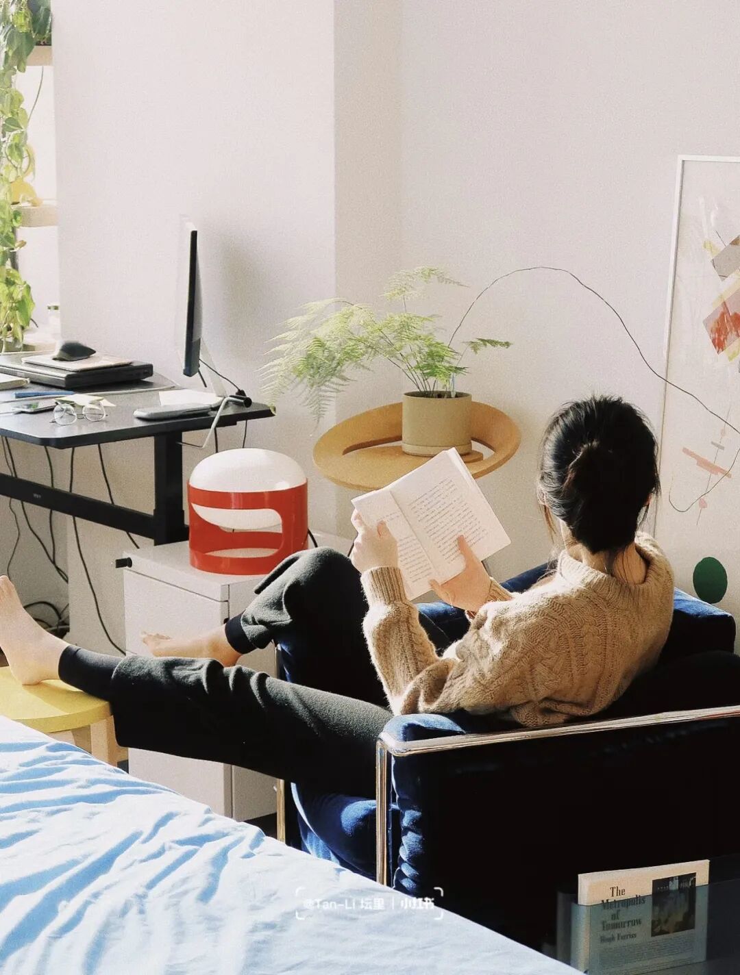 面積不大,只有 30m²,客、餐廳和臥室共享一個空間。她巧妙做空間區隔:以白色圓形餐桌為中心的區域是餐廳,餐桌上一盞akari的吊燈,會讓食物看起來更美味;一個藍色的單人沙發+書桌,是她的學習辦公區;開放式書架,猶如一個流動的百寶箱,美麗地展示各種書籍和收藏品;小小一張床,包容夜晚的好夢……