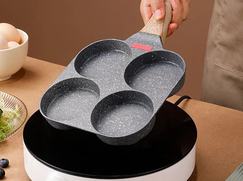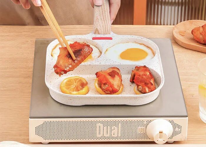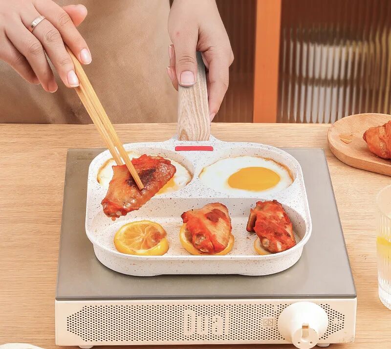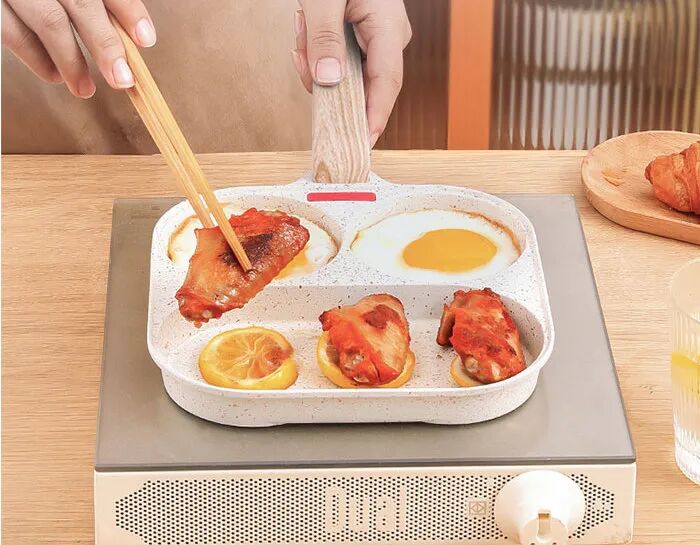 但那個小煎鍋只能單獨用,這個摩蘭德MITCMOLARD四格麥飯石小煎鍋就能做到電磁爐、燃氣都能上灶,而且同時烹飪多種美食都不串味,省電又省氣。