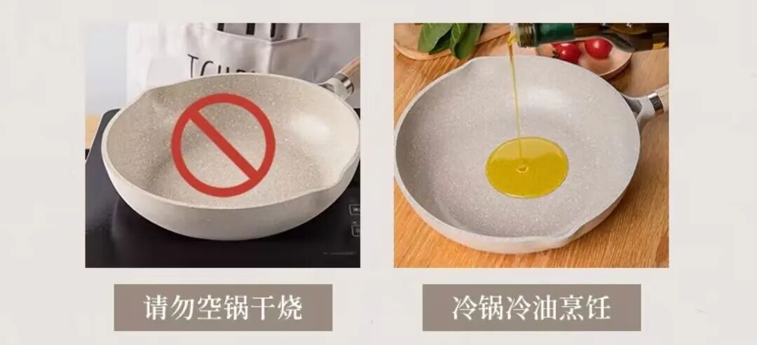 空鍋乾燒會引起變色,減短使用壽命, 建議先倒入油,再開火加熱,冷鍋冷油烹飪以免損壞鍋底。