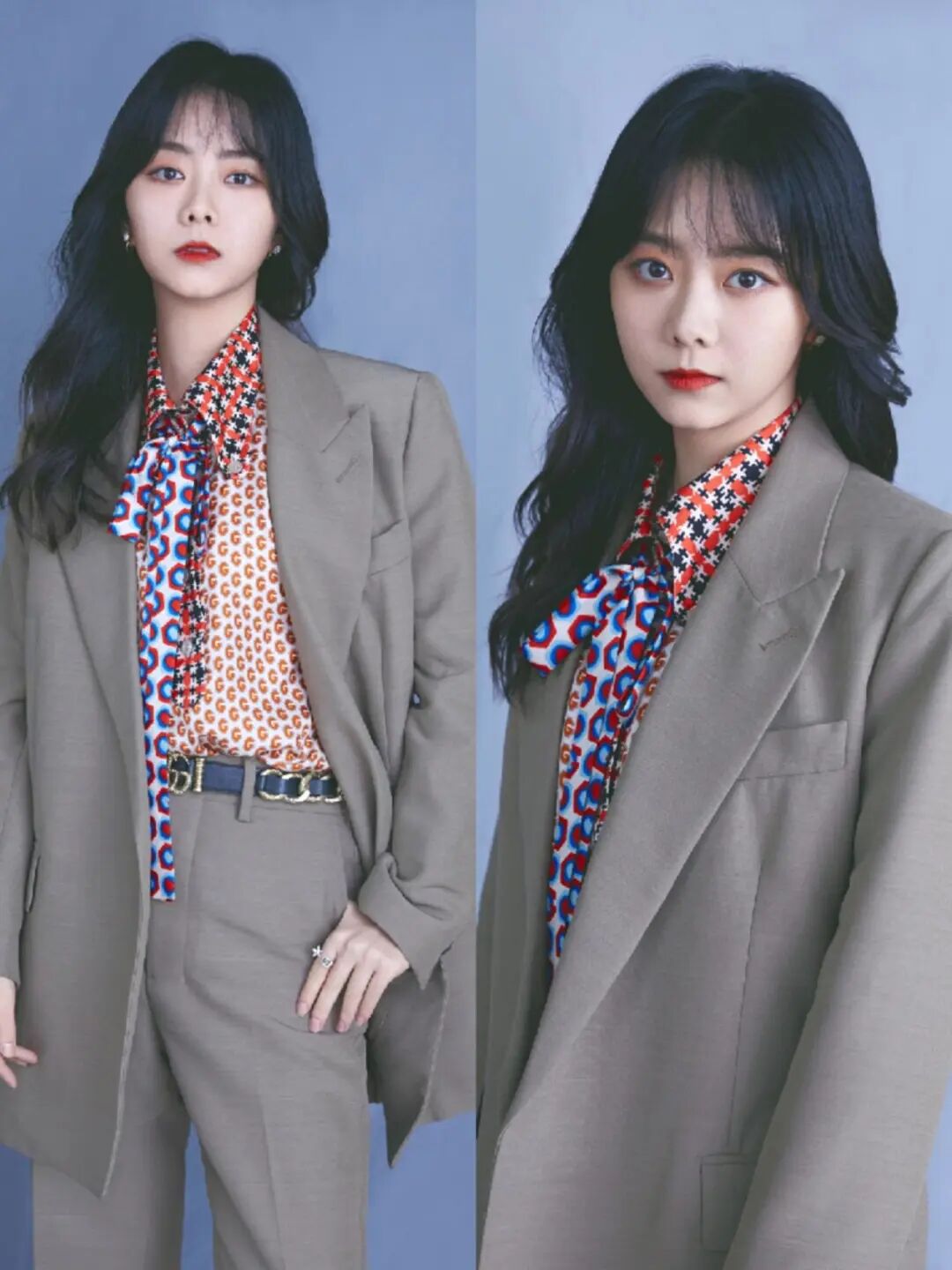 這樣一來,原本顯老的一套灰色西裝,在她的搭配下,反而顯得更幹練簡約,並且花色襯衫在這套西裝的襯托下,又不會顯得花哨,在搭配鮮豔的領帶反而穿出了一種文藝復興時的古風,腰間的環扣皮帶又是一大亮點,這樣的一套衣服,讓譚松韻穿出一種元氣少女的輕快風格。