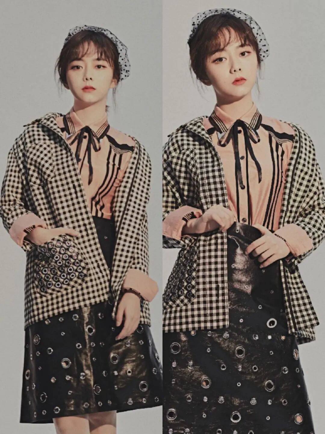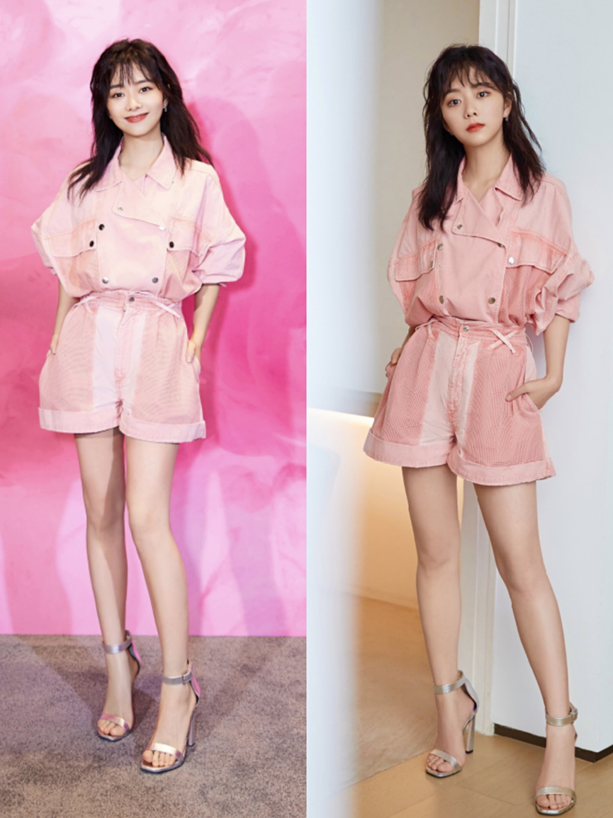 粉色可以說是最減齡的一個顏色,譚松韻這套衣服上身的牛仔有點像工裝風格外套,大領子的設計讓這個外套看著很大方,她下邊是同色系的短褲,但她把外套紮在短褲裡,這樣整體看來很是乾淨利落,短褲有著高腰和收腰的作用,讓整體下身的比例拉長。這套衣服有著網格的設計,原本只有單調粉色變得很高級。