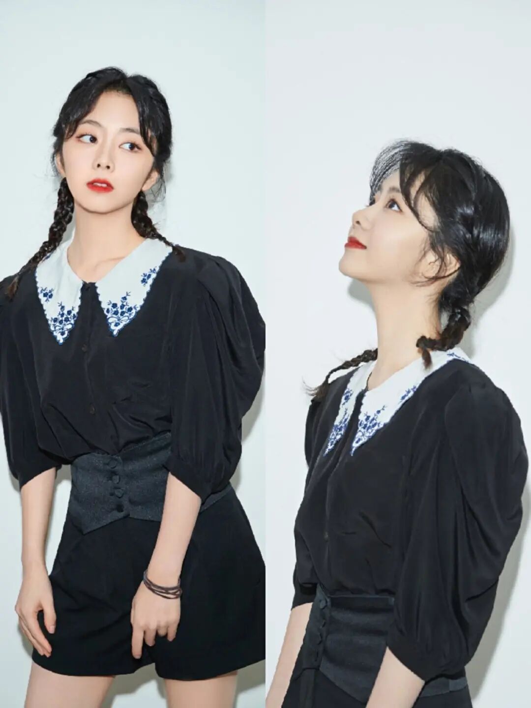 下身是高腰短褲,在腰上有著收腰的作用,這樣把上身多餘的襯衫紮在短褲中,起到很好的分割作用,看著讓整體的身材比例變的絕佳。雖然整體以黑色為主,但白色翻領的刺繡藍花,讓譚松韻變的很是甜美動人。