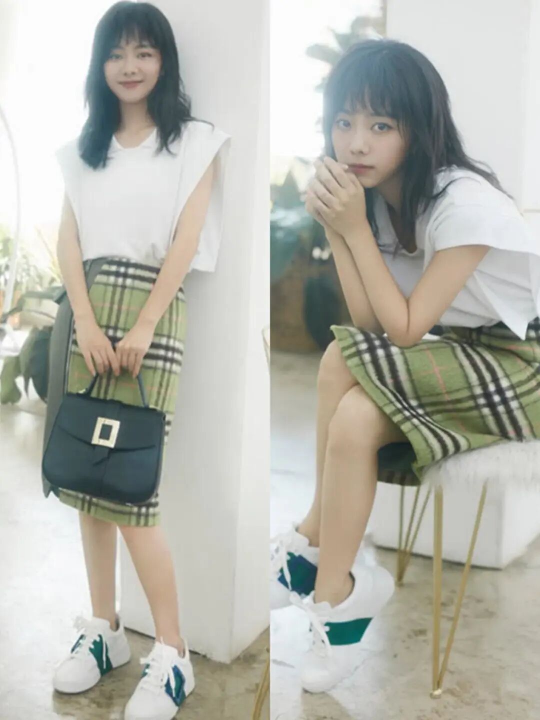白色上衣+牛油果綠色格紋裙