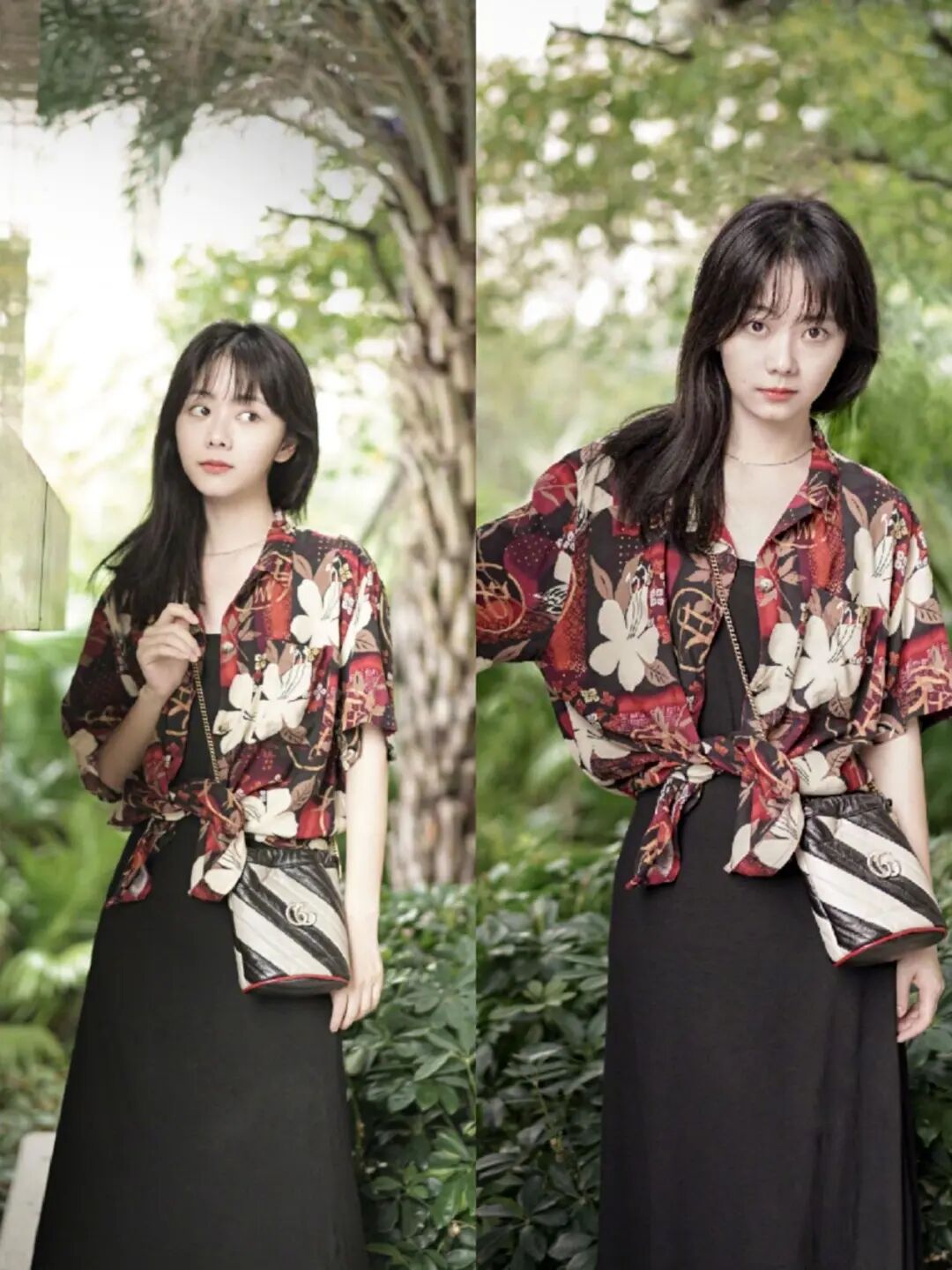 這種日系的衣服在譚松韻的身上很少見,大家所見的都是她減齡的衣服比較多。上身這件印花襯衫的花色明顯,很是顯眼,讓人一下子就注意到了,所以她裡面搭配的是一件純黑色的吊帶裙,襯衫只是系在腰處,一是提高了腰線,二是讓整體不會這麼突兀,也正是因為上身這件印花襯衫,所以在飾品上就選擇了簡簡單單的項鍊,這樣也能凸顯出她的鎖骨和天鵝頸,整體看來還是和譚松韻本身的風格很相似,而且簡單還驚豔。