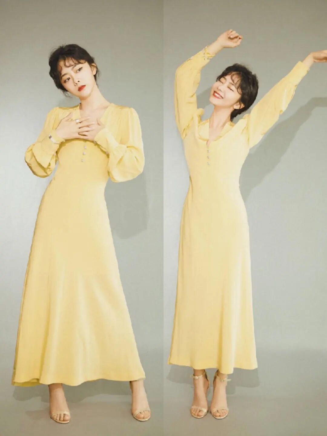 譚松韻這件連衣裙顏色的選擇跟她本身的性格很一樣,都是積極向上,陽光明。裙子v領的設計,剛好可以顯示出譚松韻的鎖骨,胸前釦子的設計,不會讓整體顯得很單調,這件裙子又是高腰的設計,從視覺上提高了她的腰線,從而突出腿的比例,袖子是泡泡袖、袖口又是收縮的設計,剛好可以表現出譚松韻活潑的性格。這樣的一件淡黃色連衣裙,加上她臉上甜甜的笑容,會讓人覺得很是溫柔,就像"太陽公公"在身邊一樣溫暖。