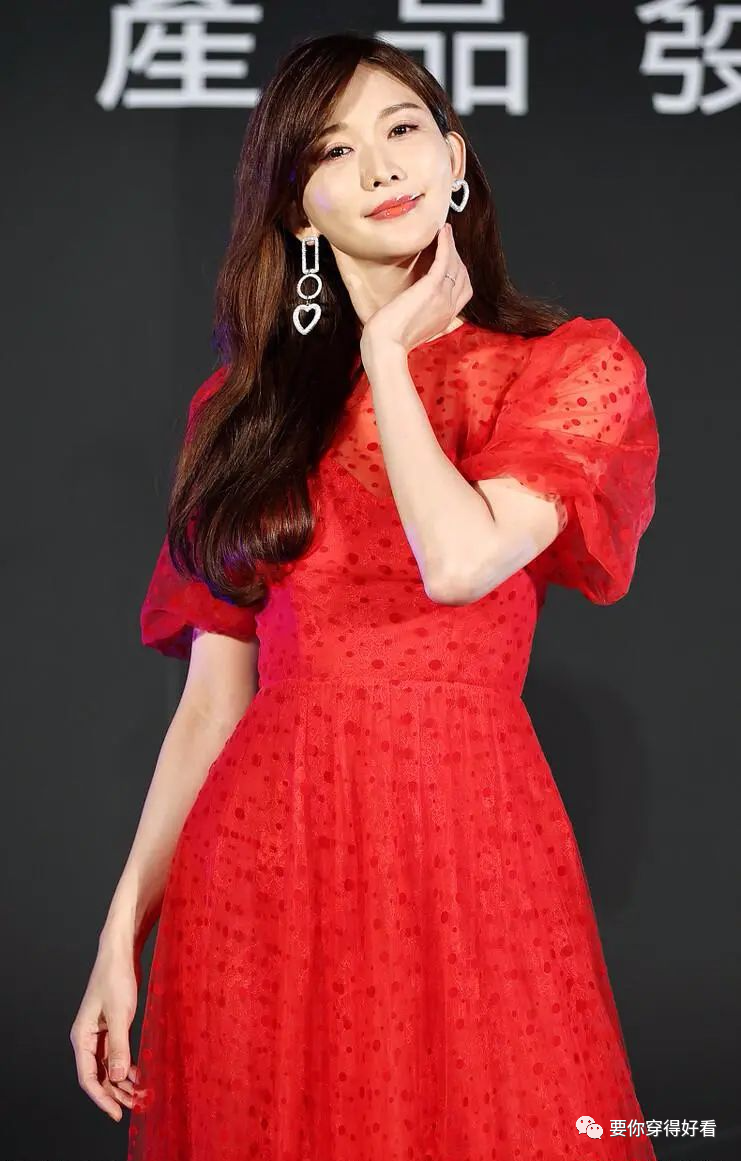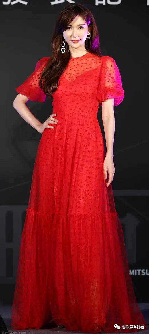 都說有氣質的女人必不可少一件紅色的衣服,志玲姐姐此次出席活動時就穿著這樣的紅色波點紗裙,嫵媚性感當中又帶著小女人的知性與柔美。朦朧而美好的紗織長裙配上蓬鬆的泡泡袖,收緊的腰部設計更能凸顯出腰部纖細的線條感。