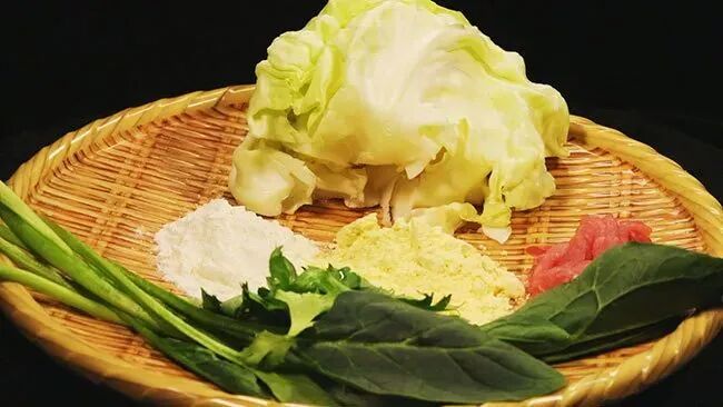 食材:芹菜葉 菠菜 圓白菜 小米麵 麵粉