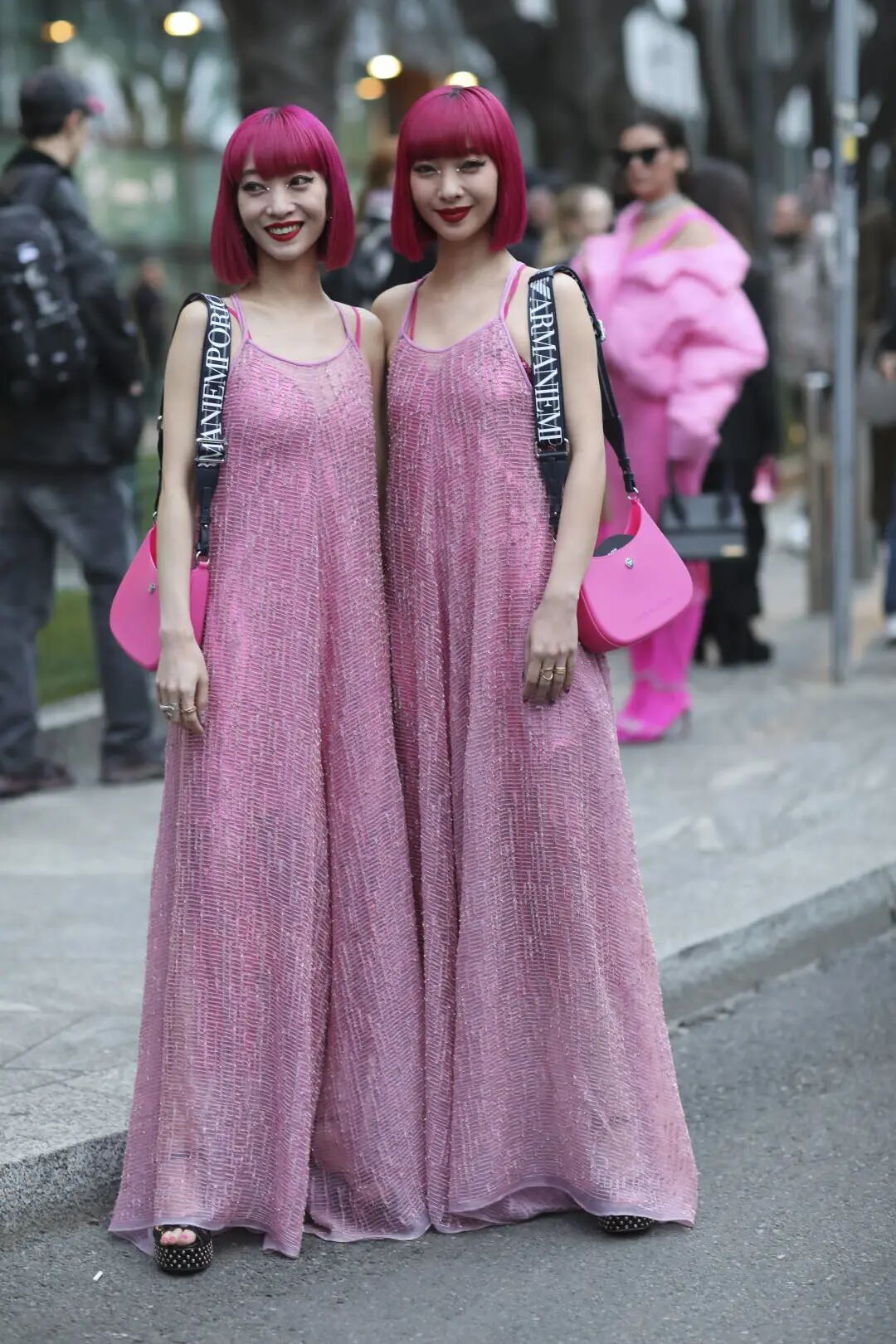 時裝週街拍常客Aya和Ami姐妹花,也很愛穿粉色,如果選一套LOOK的話,這個裙裝可以借鑑,同色系不同飽和度的包包來陪襯,色彩舒服和諧又不雜亂。