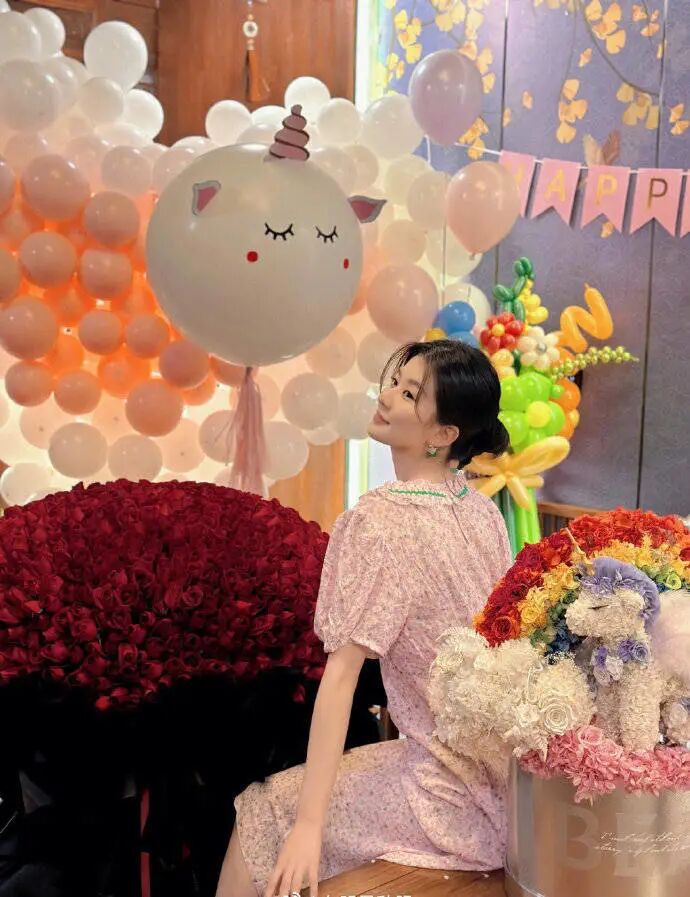 喬欣過生日穿的淡粉色印花裙裝也很可,低飽和度的粉色既恬淡溫婉,又青春減齡。