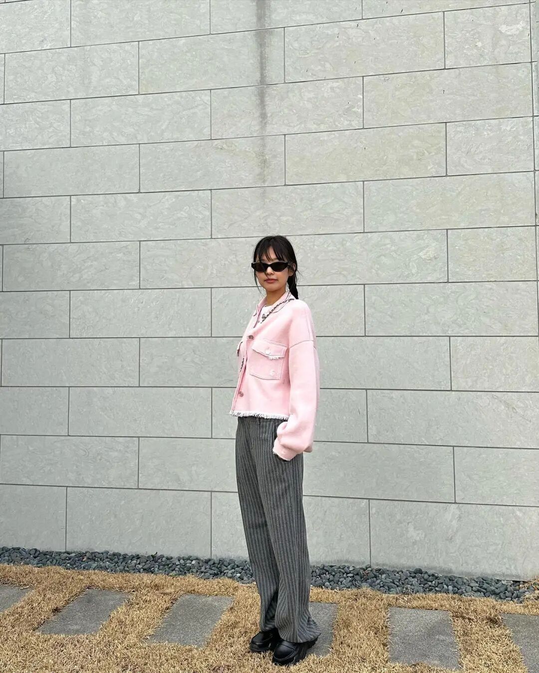 想要實穿一點的話,Jennie的LOOK可以學學,淡粉色的毛呢小外套搭配灰色高腰闊腿褲,優雅小公主的feel,簡約舒適又落落大方。