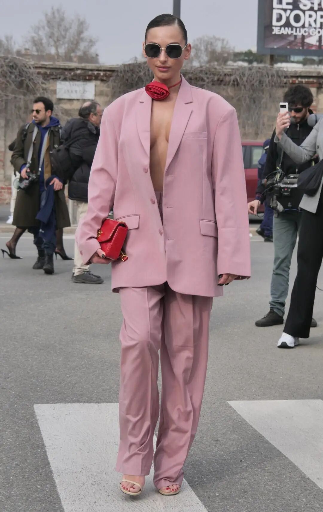 裸粉色全套西裝出街真的很炸,不過真空穿西裝這事兒生活中咱們還是別玩了,內搭一件深V背心同樣不影響酷颯的效果。
