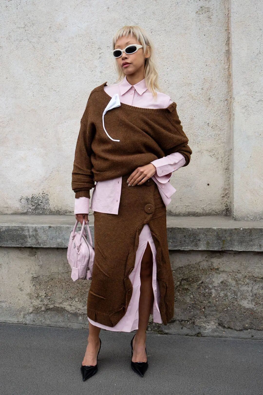 亮粉色的 翻領毛衣,單看是不是沒什麼出奇的?但這位博主搭配著棕色的寬鬆工裝褲,立馬就變得颯爽了,加之墨鏡、耳環等誇張一點的配飾來點綴,時髦味兒立馬就有了。
