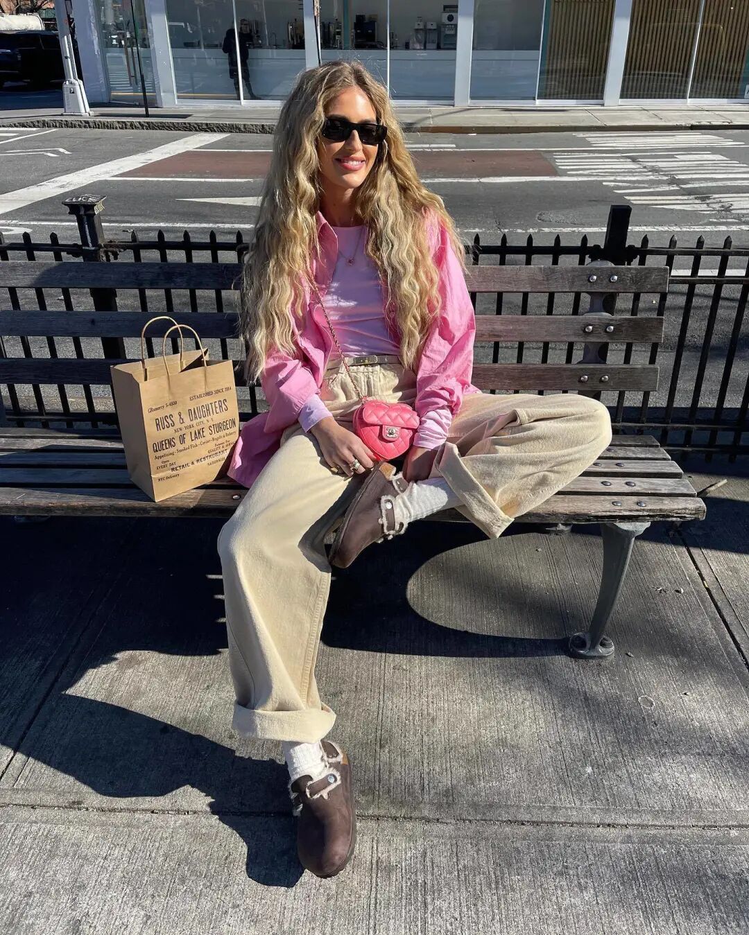 這位時髦精把粉色穿的放蕩不羈、隨性自如,但卻有著非常順眼的好看,不妨也試試寬鬆襯衫+白T+寬鬆牛仔的搭配方式吧。